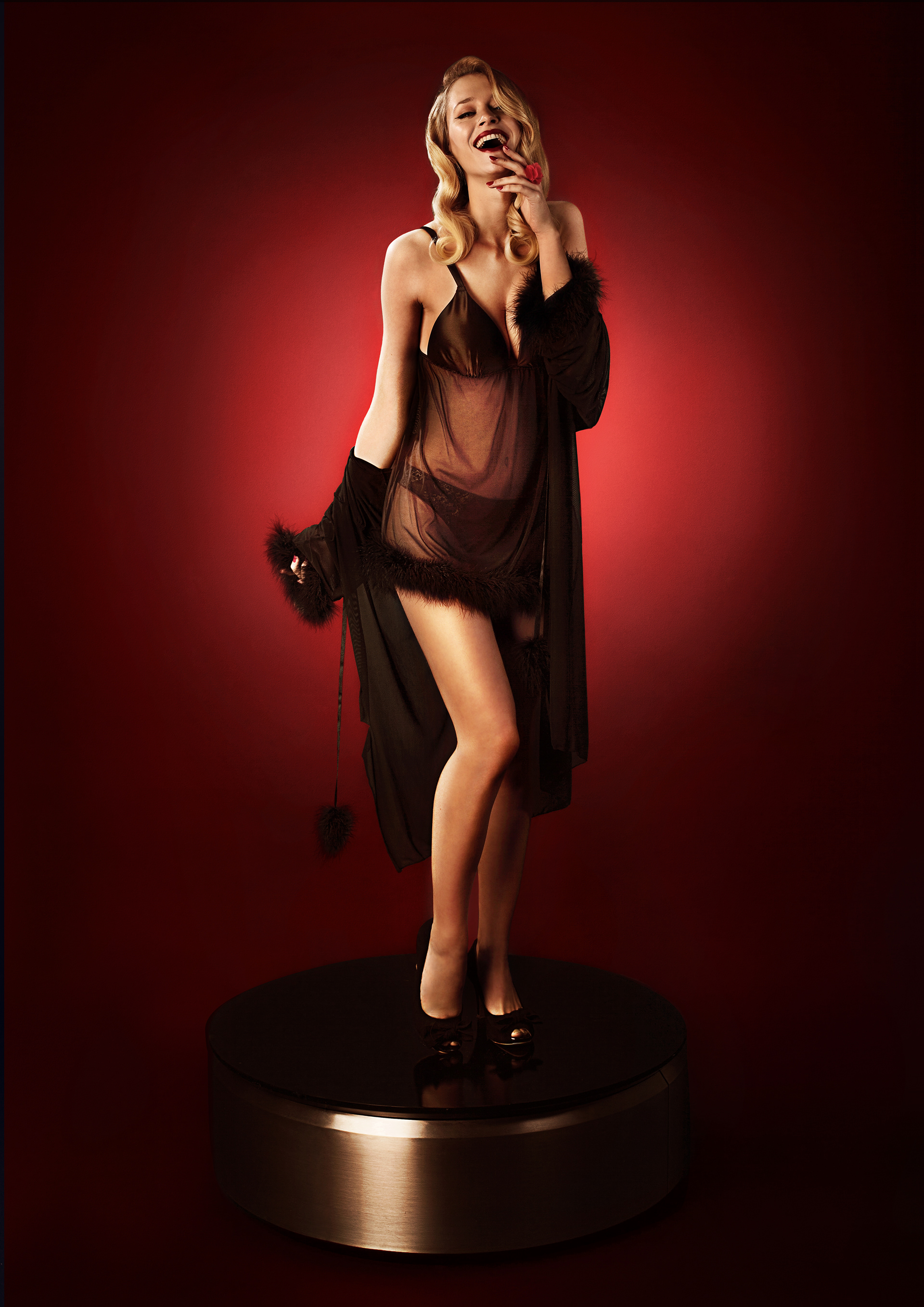 Le rouge profond du décor, associé aux jeux de lumière gobo, transforme l’espace en scène captivante. L’ambiance flirtante, sensuelle et légèrement surjouée frôle le burlesque, donnant à la campagne une personnalité à la fois vive et espiègle.
