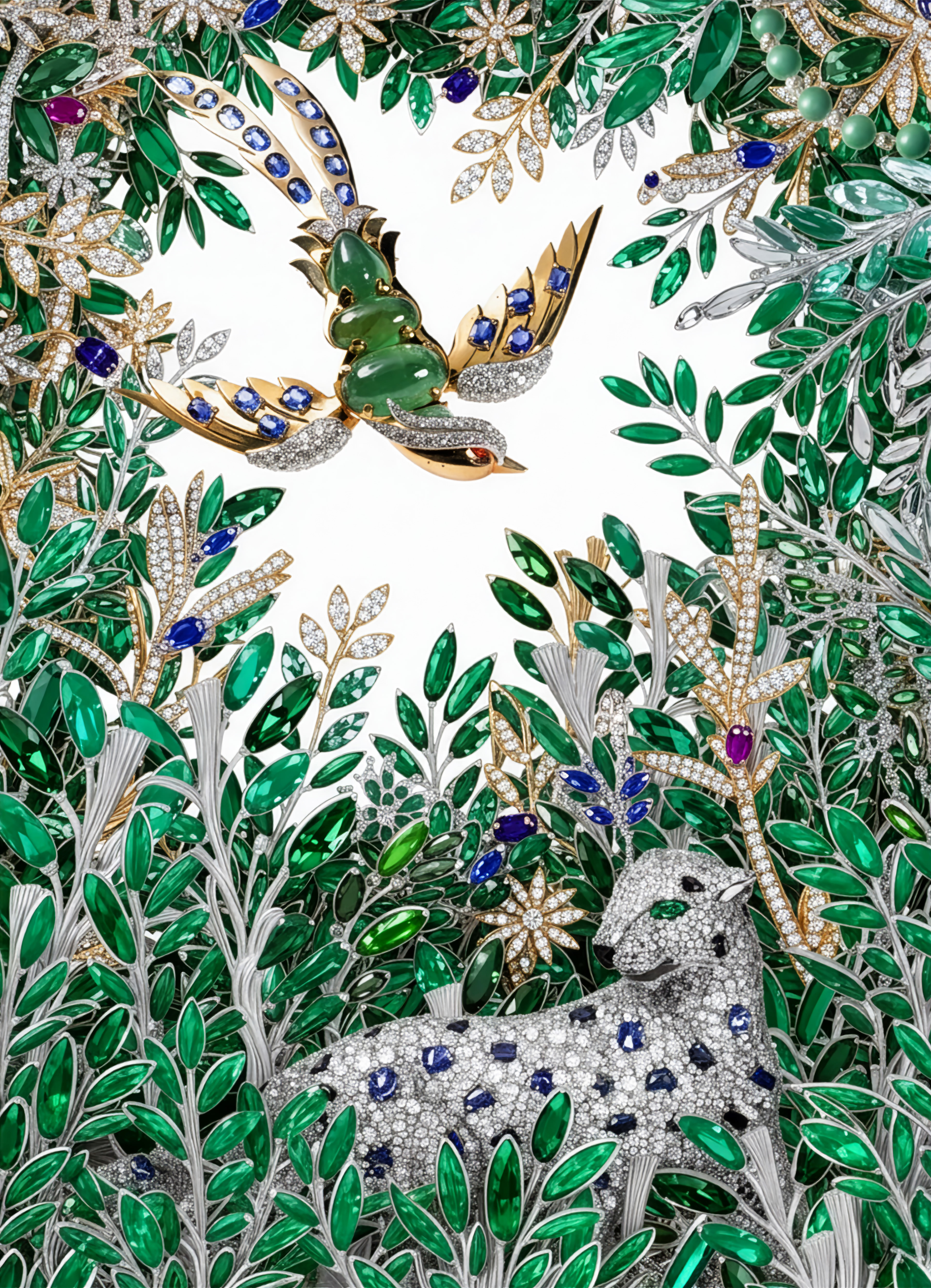 L'inspiration de la maison s'étend au royaume végétal avec une exquise délicatesse. Des fleurs précieuses, ornées de rubis et de diamants, côtoient des branches aux feuilles d'émeraude au réalisme saisissant.