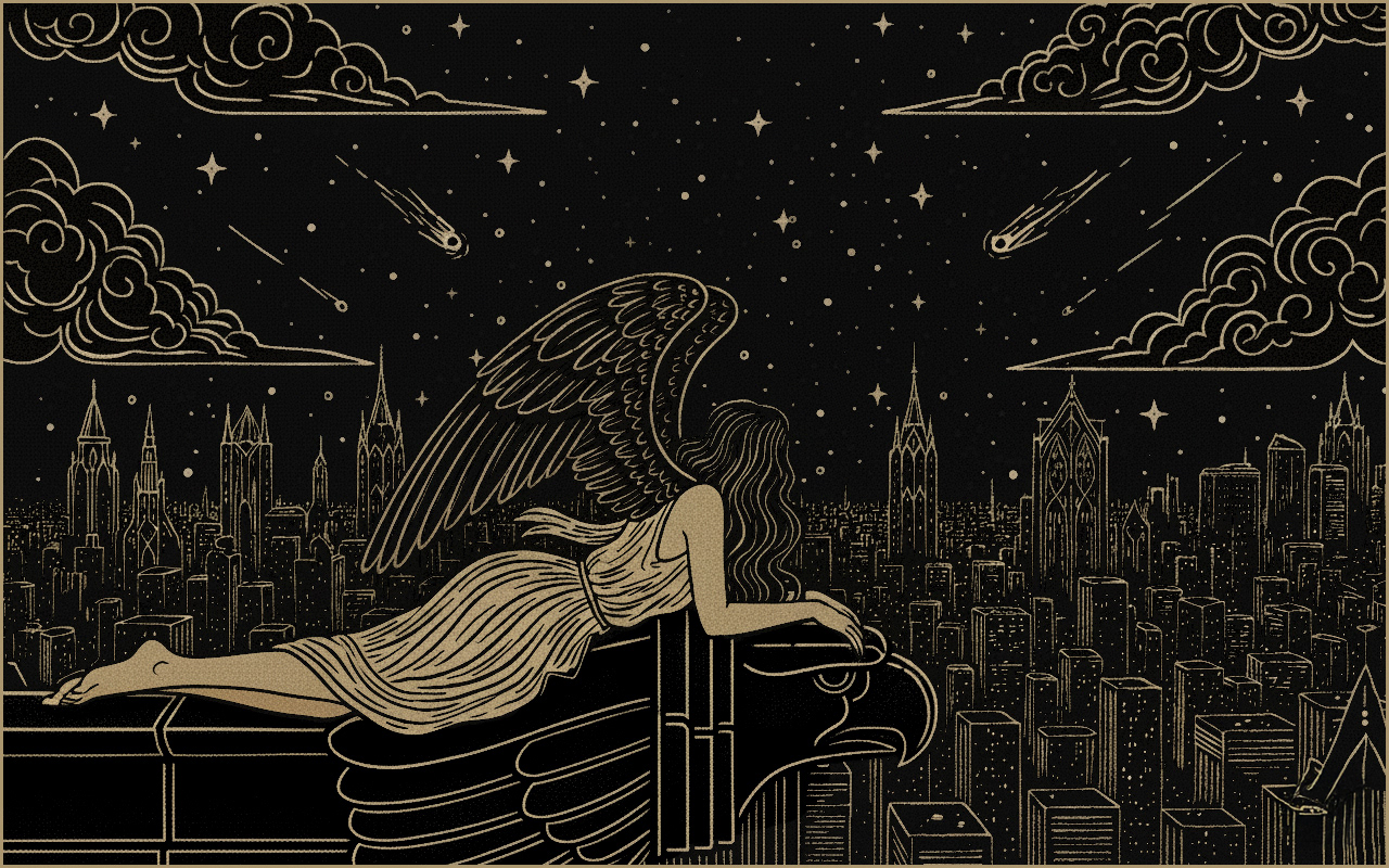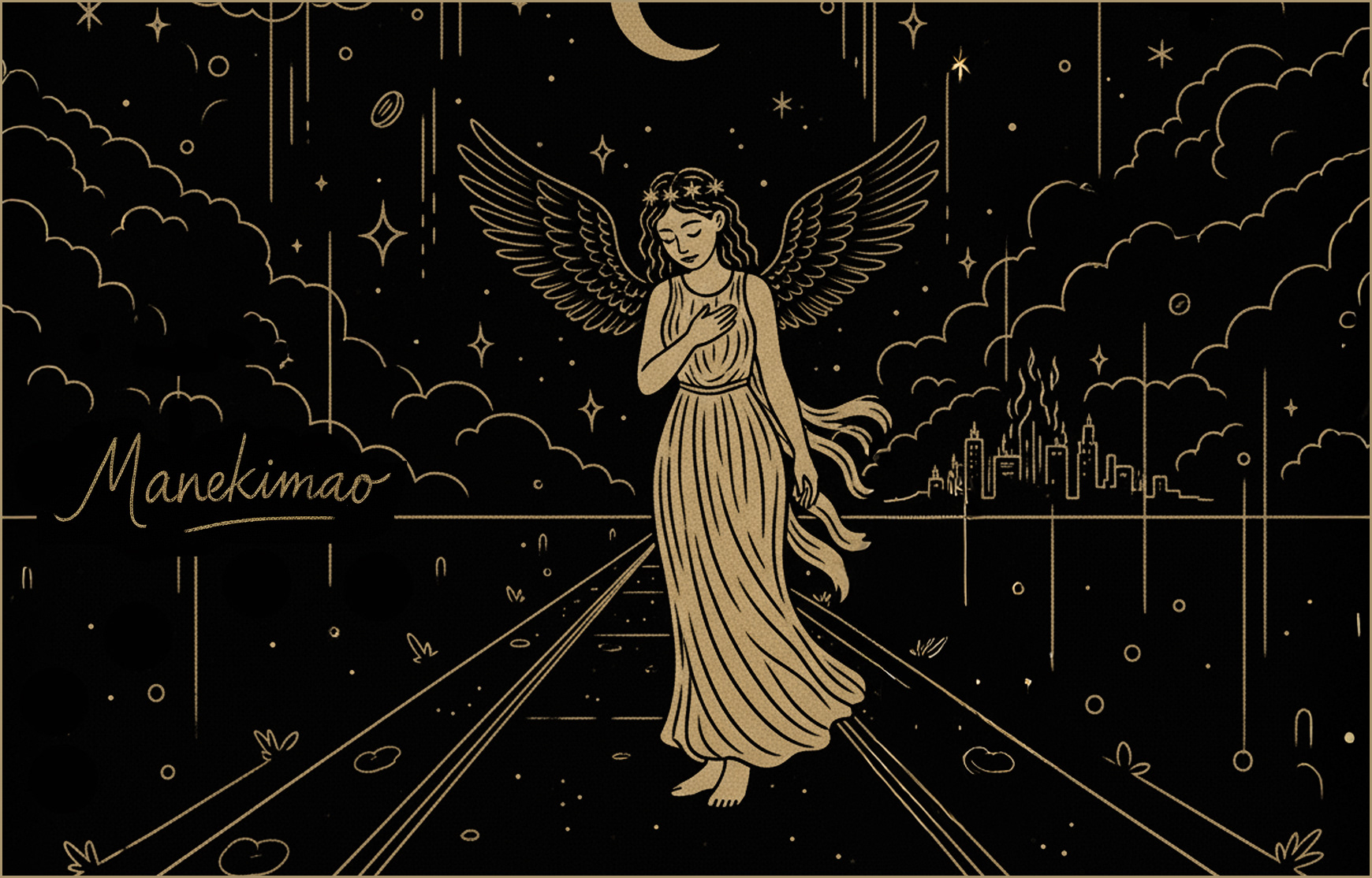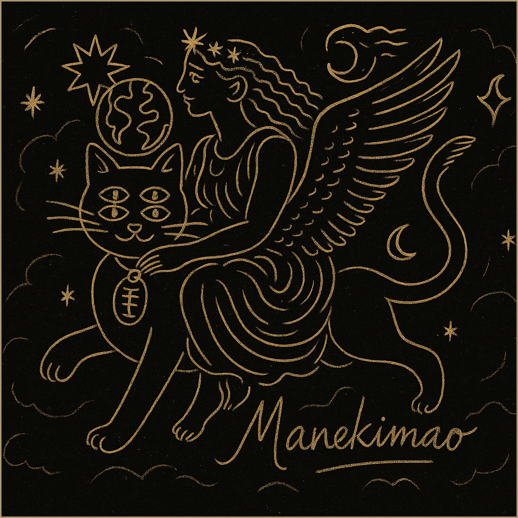 Pour traduire cet univers, le studio Astraelux a conçu une identité graphique et une cover d’album élégantes, intemporelles et symboliques. Les lignes fines et dorées évoquent des figures mythologiques, des anges et des créatures mystérieuses, flottant entre ciel et terre. Le chat à quatre yeux s’impose comme un personnage central, figure mystique et poétique, dont le regard multiple ouvre la porte d’un monde invisible.