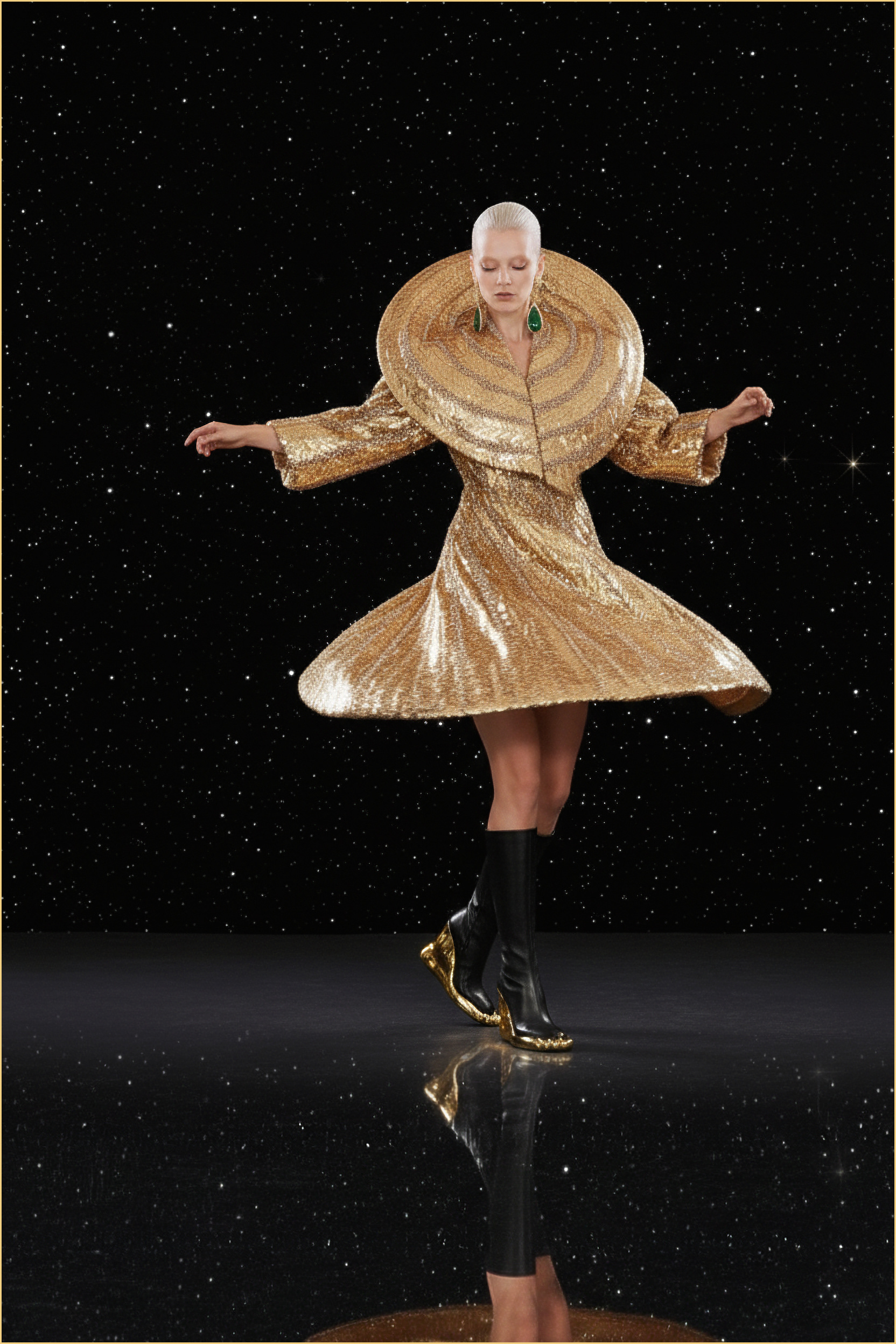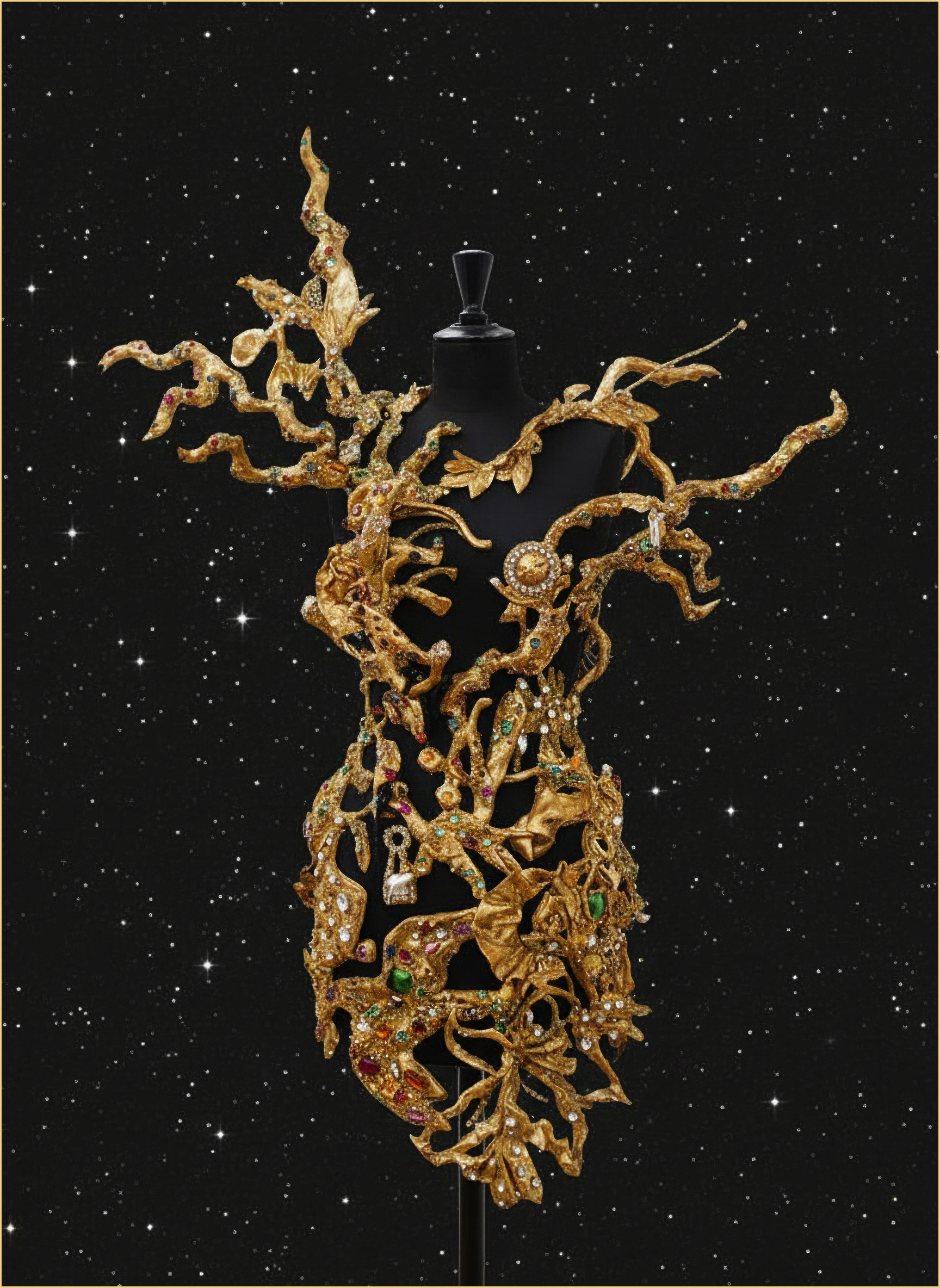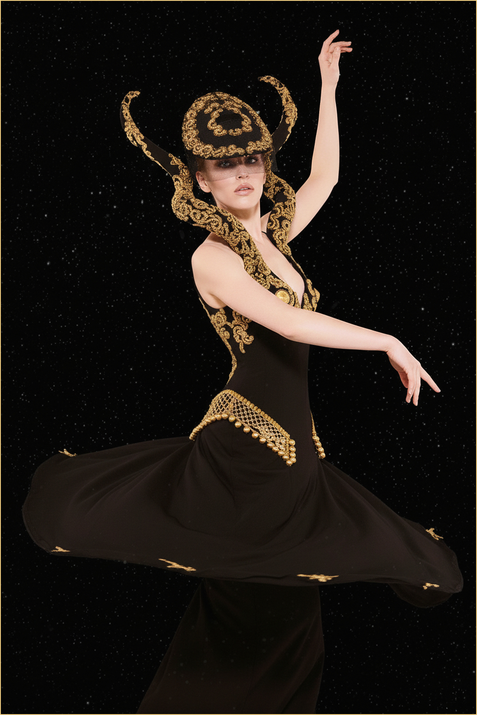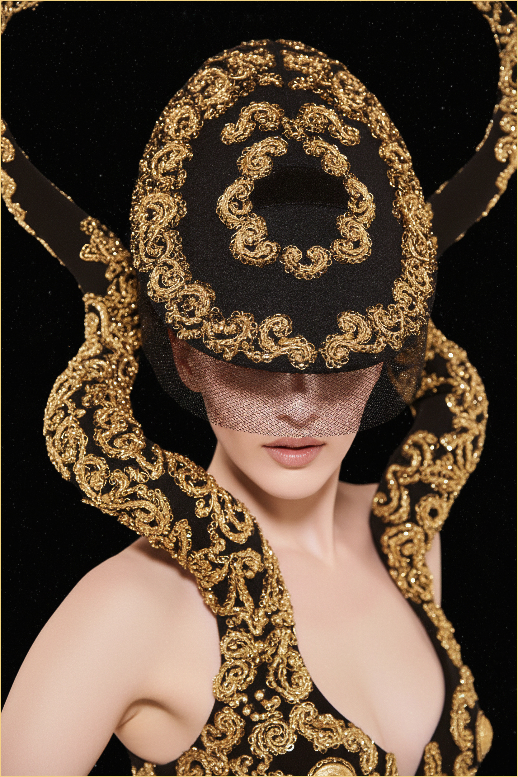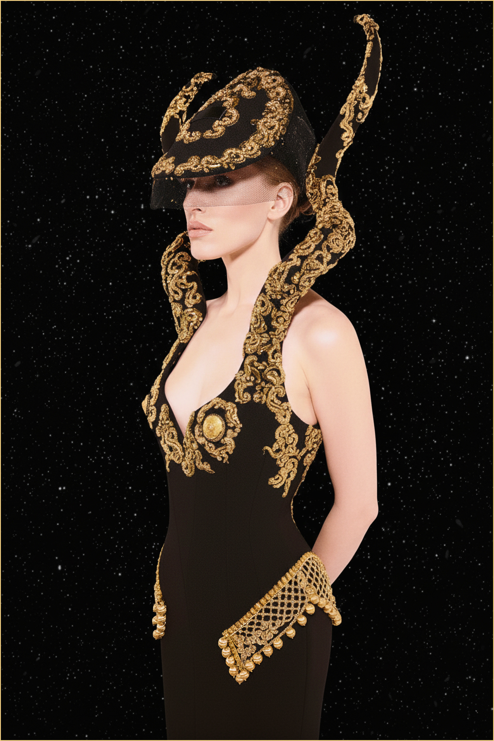 Des créations révélées dans un écrin de nuit, où l'or et le noir s'enlacent pour donner naissance à des silhouettes d'une élégance animale. La fantaisie est omniprésente, dans le moindre détail, dans chaque pièce : un ballet de formes et de matières où la femme devient une créature mythique, à la fois sombre et lumineuse, puissante et délicate.